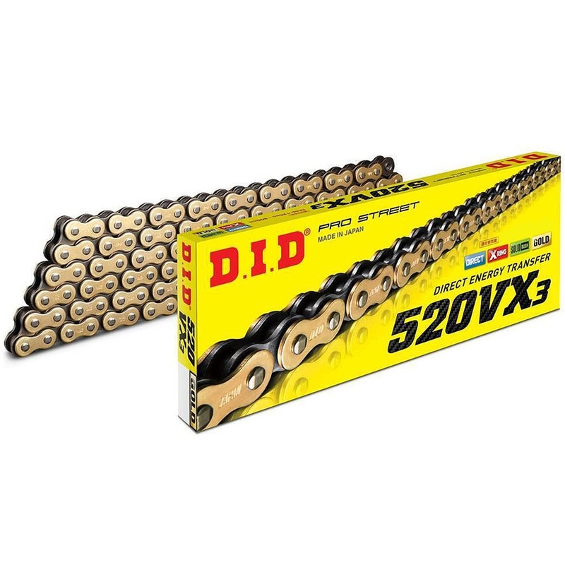 520VX3GBx094 Gold Heavy Duty X-Ring DID Chain D.I.D's VX Series boasts a much longer chain life than the VO Series due to the patented X-Ring technology. The 520VX3 has a 32% longer chain life than the 520VO and the 525 and 530VX3 has a 41% longer chain li