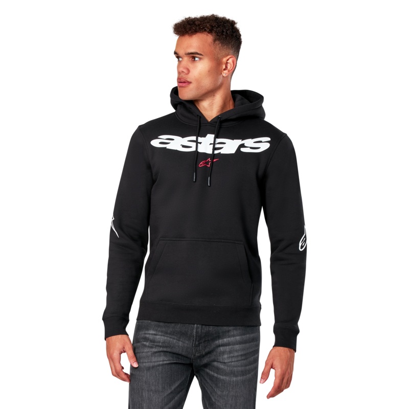 Alpinestars Elliptic HoodiePULL OVER FLEECE HOODIEPull over hoodie with kangaroo pocketArched Astars logo art print at upper chest, with sleeve logos and forearm Astars printsSelf lined hood, dipped drawcord tips, rib cuffs and hemInternal main label and e