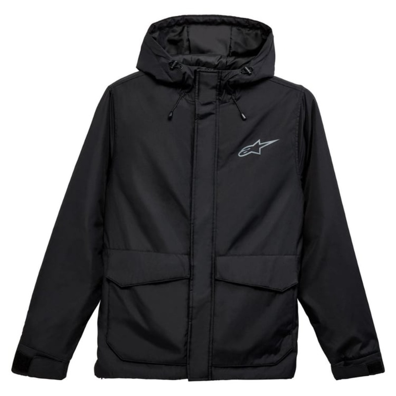 Features: Insulated Jacket Warm jacket with sherpa lined body and poly fill sleeves Poly filled hood with bungie adjusters. Front storm flap, inner waist drawcord Hand pockets under cargo pockets, velcro tab cuffs and bungie hem Internal main label and ext