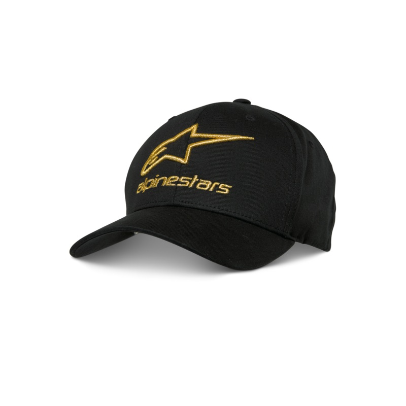 Alpinestars Glid HatCurve bill with structured crownFlex backStretch twill main fabricGold metallic 3D embroidery front, flat metallic embroidery side and backInternal and labeling