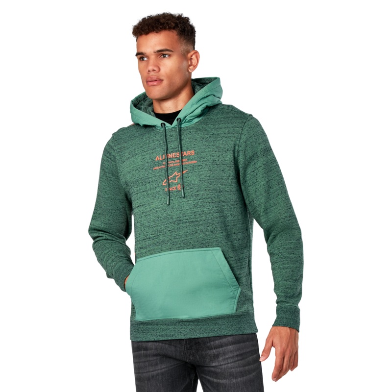 Alpinestars Occurance HoodieGARMENT OVERDYE PULL OVER FLEECE HOODIEPull over hoodie with poly overlay kangaroo pocket and hood.Garment overdye on heather fleece. Center chest and large back printsSelf lined hood, dipped drawcord tips, rib cuffs and hemInte