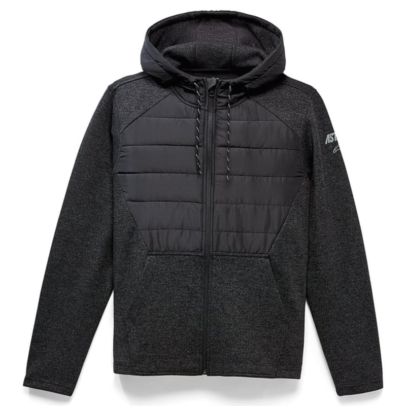 Features: 79% Polyester / 15% Rayon / 6% Spandex, 320g/m2 Hybrid Tech Fleece Jacket with Quilted Front Poly fill quilted front panel, poly overlay hood, tech fleece body Reverse coil zipper at front, pouch pocket, yarn dye draw-cord Fold finished cuffs and