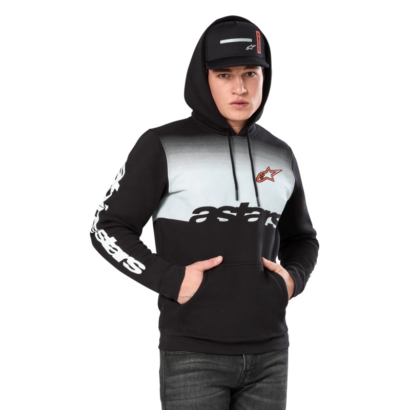 Alpinestars Specter HoodieFeatures:Oversized fit pull over fleece hoodiePullover hoodie with body seaming and kangaroo pocketFront embroidery patch and back embroidery logoSelf lined hood, dipped drawcord tips, 2x1 rib cuffs and hemInternal main label and