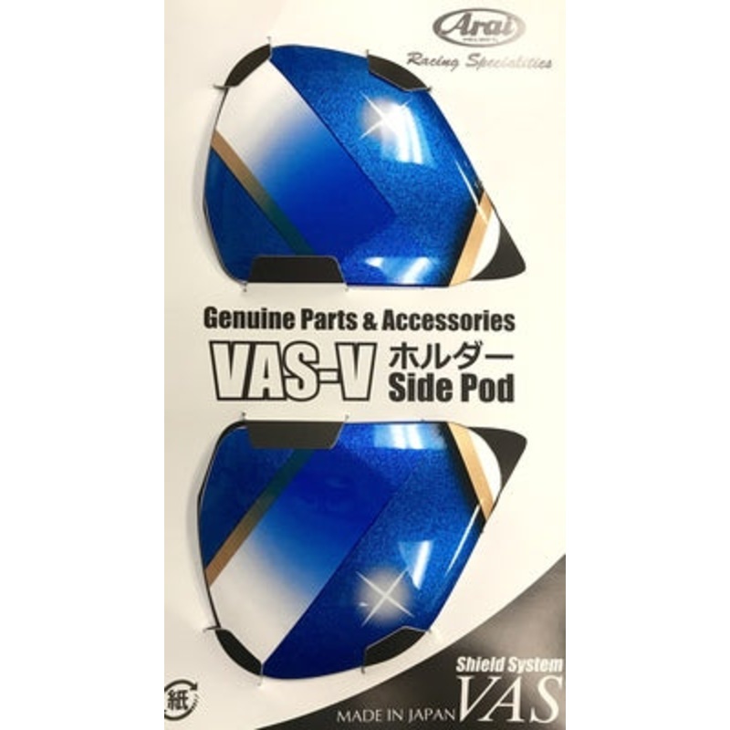 Arai RX-7V Side-Pods Pedrosa Samurai (Set)VAS HOLDER POD SET PEDROSA-SAMURAI Color matched holder/pod set for the VAS (Variable Axis System). Base plate (#1066) and mounting screws set (#2511) sold separately
