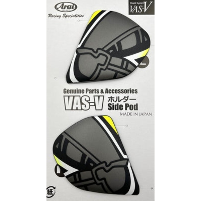 Arai Vas-V Side-Pods-Iom 2019 (Set)Color matched holder/pod set for the VAS (Variable Axis System). Base plate (#1066) and mounting screws set (#2511) sold separately.
