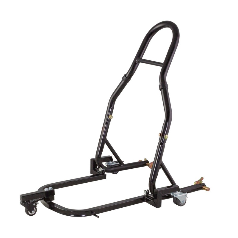 This device works in the same way as a rear paddock stand to raise the rear wheel of motorbikes. The stand incorporates a floating dolly set on 360 swivel castors, allowing the bike to be moved easily and accurately sideways and diagonally.