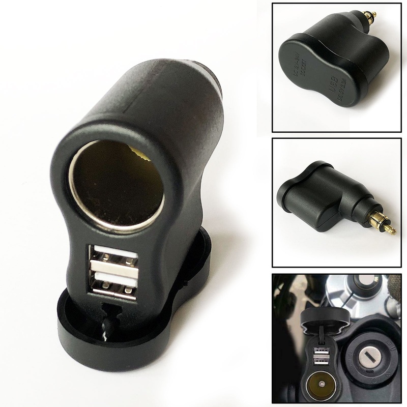 Motorcycle Dual USB Charger with Cigarette Lighter socket Power / charge two mobile devices simultaneously. Use this plug along with your devices own USB data cable in order to charge, ideal for many GPS and smart phone devices. Smaller BMW motorcycle type