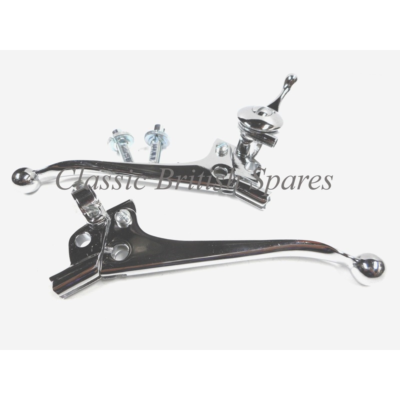 For sale is a new set of chrome clutch and brake set for classic British motorcycles. This set is imported from England by L.F. Harris and is exceptionally high quality. Comes with bright chrome finish, choke on brake perch, adjusters, correct style screws