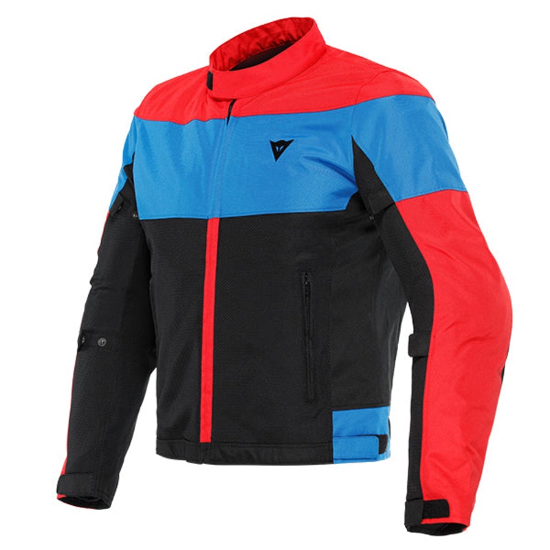 Dainese Elettrica Air Textile Jacket Black Red Blue The mens Elettrica Air Tex motorcycle jacket is a versatile, all-season garment that combines protection and ease of use. Constructed in resistant, anti-abrasion fabric, it allows for safe, comfortable ri