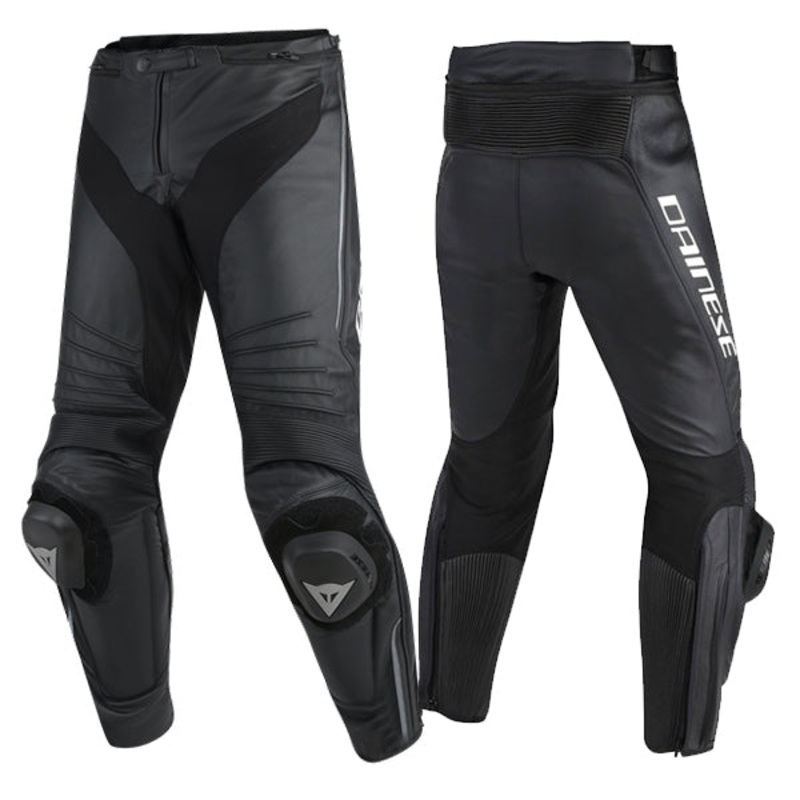 Dainese Misano Leather Pants 685 Serious sport riders will love the Misano, Daineses top leather pant, which boasts features like D-Skin 2.0 construction, Microelastic inserts and Pro-Shape soft protectors at the hips. Also standard are double calf zips, a
