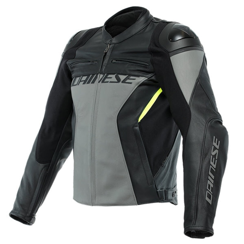 Dainese Racing 4 Leather Jacket Grey Black Leather motorcycle jacket with fitted comfortable fit, metal slider on the shoulders, stretch leather inserts and air vents for optimized temperature. The Dainese sport jacket. Racing 4 leather motorcycle jacket,