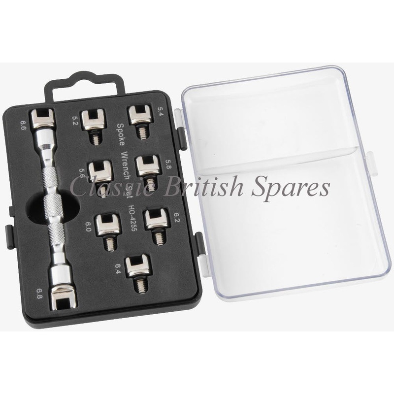 Lace your motorcycle wheels like a pro by using this new EMGO spoke wrench set. No more fiddling around with those cheap spoke wenches that don’t fit your spoke nipples properly! Set comes with everything as shown – handy durable case and 9 adapters.Adapter sizes range from 5.2, 5.4, 5.6, 5.8, 6.0, 6.2, 6.4, 6.6, and 6.8. Wrench handle measures 3 3/4″ – made of metal with a knurled finish. Each adapter has threads so you can screw it on each side of the handle. We use this same set here in our shop when we are lacing, truing and tightening spokes. Great for Triumph, BSA, Norton, Honda, Yamaha, and other brands of motorcycles.EMGOO.E.M Part number is 84-27420