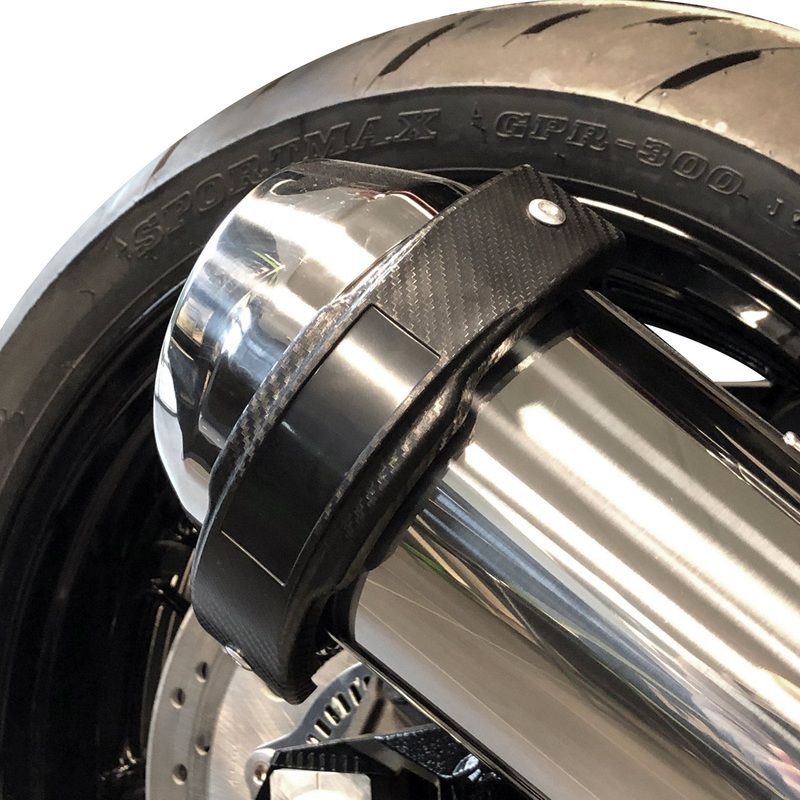 Clamp on / around carbon look exhaust guard. Fits silencers 127 -152mm Black/Carbon-Look.