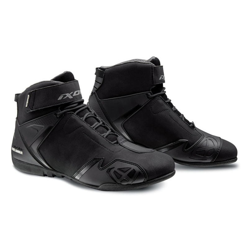 Ixon Gambler Waterproof BootsSportive sneakers with laces. Waterproof and CE certified, they hold the ankle and are reinforced at the toe, the heel and the selector areas.Features:Waterproof and breathableNylon lacing and velcro strapGear shift reinforceme