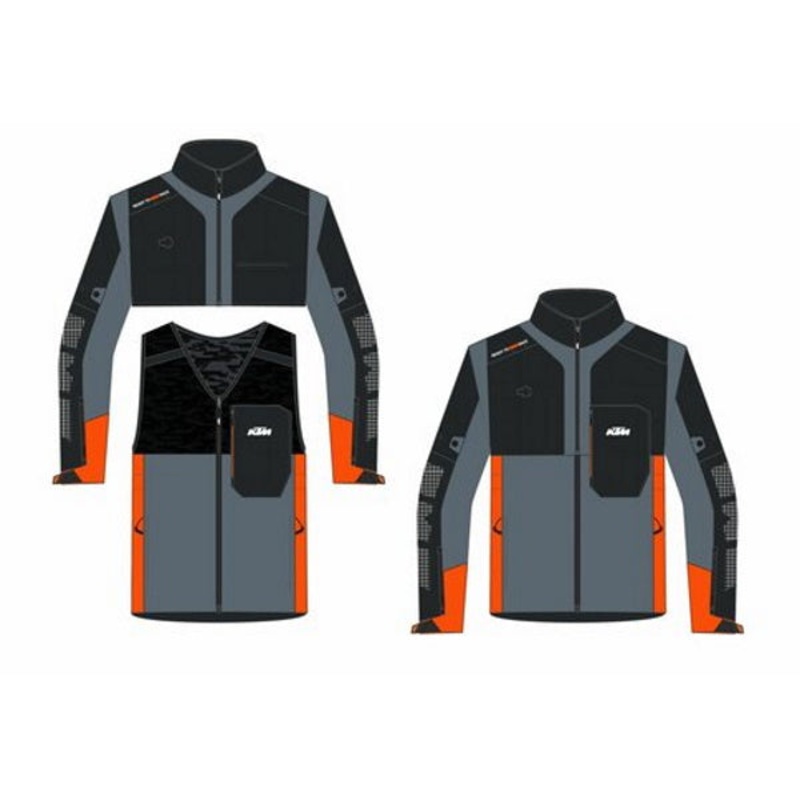 KTM Racetech Jacket - Black Grey Orange Lightweight off-road jacket with detachable sleeves Perforated ventilation zones Mesh panels Reinforced material at critical points Reinforced seams stretch panels Arm and waist width adjustment Multiple outside and