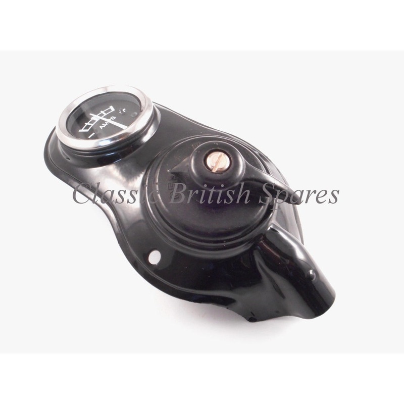 New Lucas Type Switch Panel W/ Ammeter. Comes with everything you need to fasten this panel onto your headlight shell. Switch is the Lucas type #31340 variety - 3 position (off, low, high). Ammeter is 1 3/4" suited for 6V models. Panel comes with a lovely