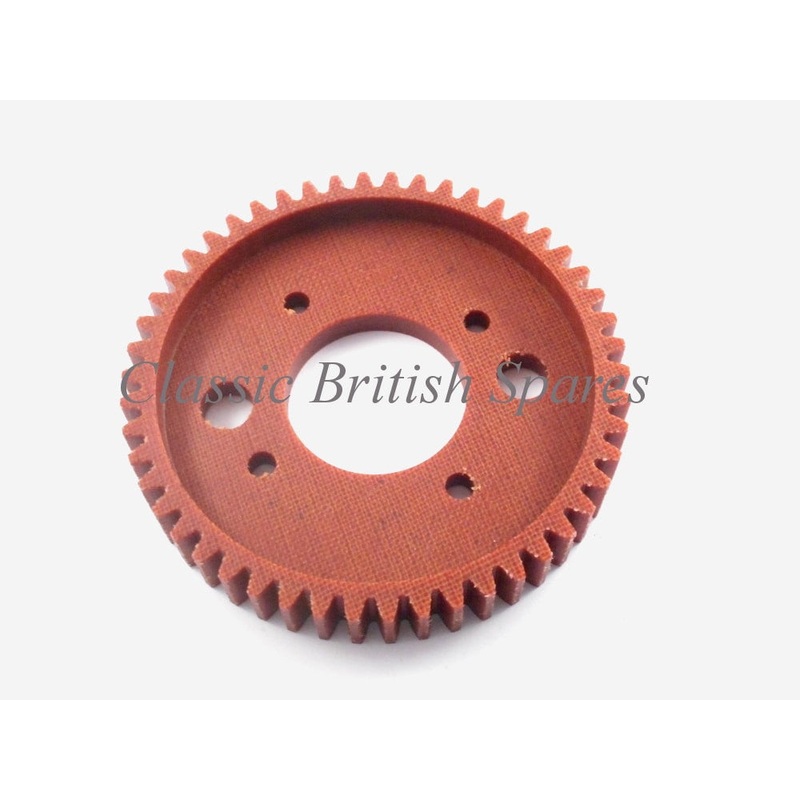 New Triumph Lucas Magneto Fiber Drive Gear. Replace your stripped fiber drive gear with this English made part. Designed to replace Lucas part number 47502. Drive gear features 50 teeth. Suited for Triumph models with Lucas K2F ATD (auto-advance timing con