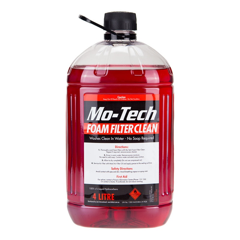 Mo-Tech Foam Filter Cleaner - 4 Litre containerSpecially formulated for foam air filter servicing.Safely removes oil and dirt - will not degrade foam or glue. Note: - Read directions on label before using this product.Warning: - This is a DG Flammable Prod