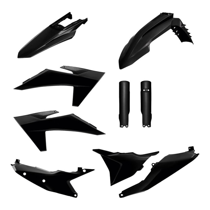 Polisport Full Plastic Kit to suit KTM BLACKFront Fender - BlackRear Fender - BlackRadiator Shrouds - BlackSide Panels - BlackFork Guards - Black Polisport plastics are injection moulded for a perfect OEM type fit. Manufactured from a Durable Gloss Polypro