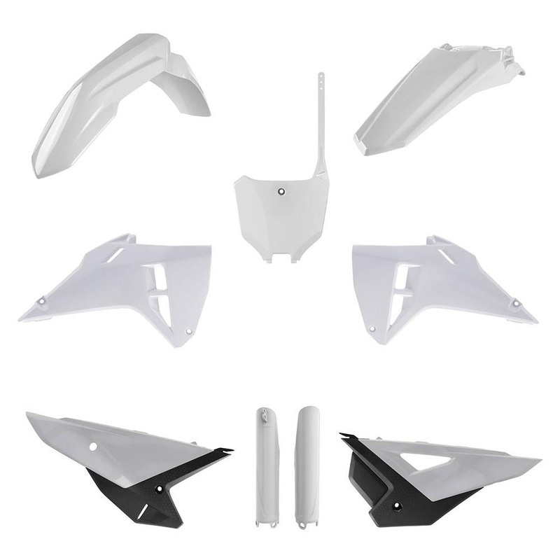 Polisport Full Plastic Kit to suit HondaFront Fender - WhiteRear Fender - WhiteRadiator Shrouds - WhiteSide Panels - WhiteFront Number Plate - WhiteFork Guards - White Polisport plastics are injection moulded for a perfect OEM type fit. ManufactuWhite from