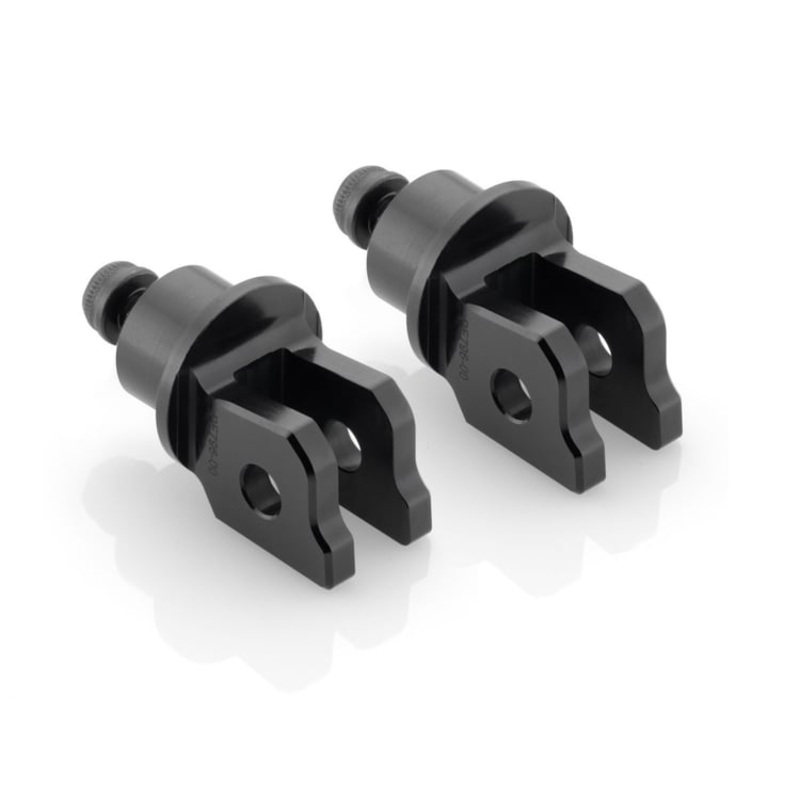 This kit is required to install either the Rizoma Rally or Touring Footpegs. Features: CNC-machined for a precise fit and finish Set screw holes to prevent the footpeg loosening and/or rotating Corrosion-resistant mount bolt Reuses OEM pin and spring Sold