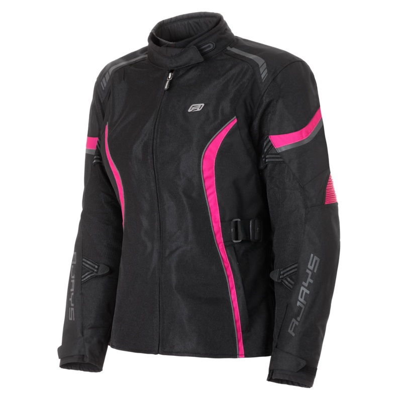 Rjays Athena Air Women's JacketOuter Shell: Polyester 600D.CE Armour in the shoulders & elbows.Elbow protectors are height adjustableEVA Rubber back pad.Waterproof & breathable membrane (10,000mm/8,000mm)Removable 100g Thermal jacket with knitted collar.Th