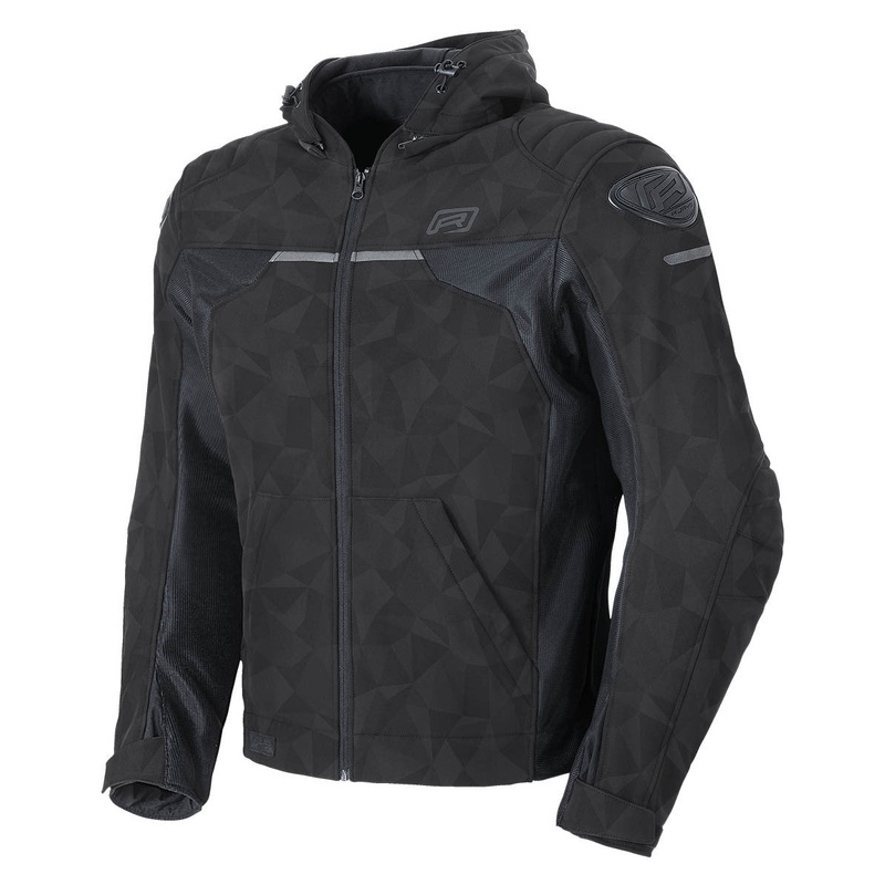 Rjays Mission HoodieOuter Shell: Softshell 3-layer fabric & Poly 500D MeshReinforced protector pockets with DuPont Kevlar Fibre based fabricPU Shoulder cup protectorCE L2 Armour in the shoulders & elbowsEVA Rubber back padPoly mesh comfort linerLarge mesh