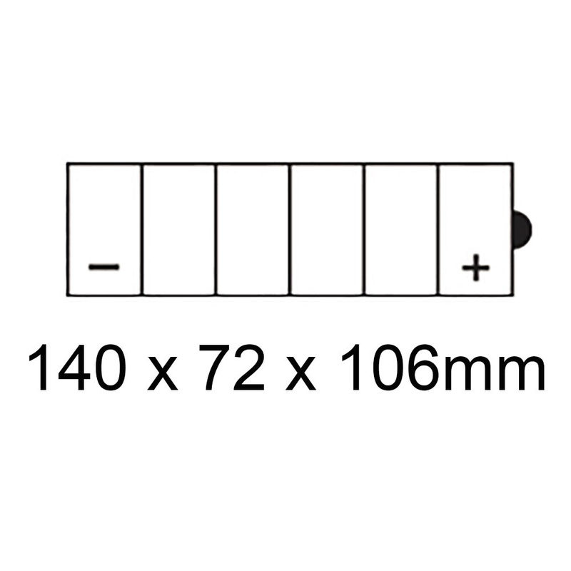 ROADSTAR Lead Acid Flood Cell Series12 Volt 6.5 Ah CapacityDimensions (mm) - L 140 x W 72 x H 106Terminal configuration - Negative [Black] LH front polarity with RHS Breather OutletTerminal type - Negative & Positive T5 LeadThis series of batteries can onl