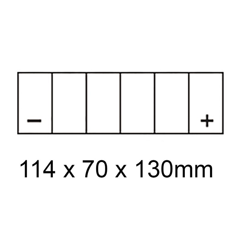 Lead Acid Maintenance Free AGM Series supplied with the electrolyte acid pack.Add the battery electrolyte to each cell as per the instructions and charge the battery before fitting into the motorcycle.12 Volt 6 Ah CapacitySize (mm) - L 114x W 71 x H 131Ter