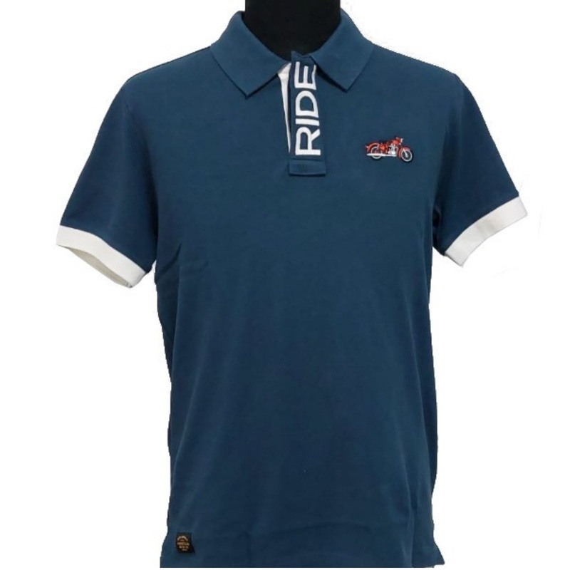 100% cotton, navy polo shirt, with white trim and under collar. Red Classic 350 embroidered on the right side of the chest and RIDE on the collar facing.