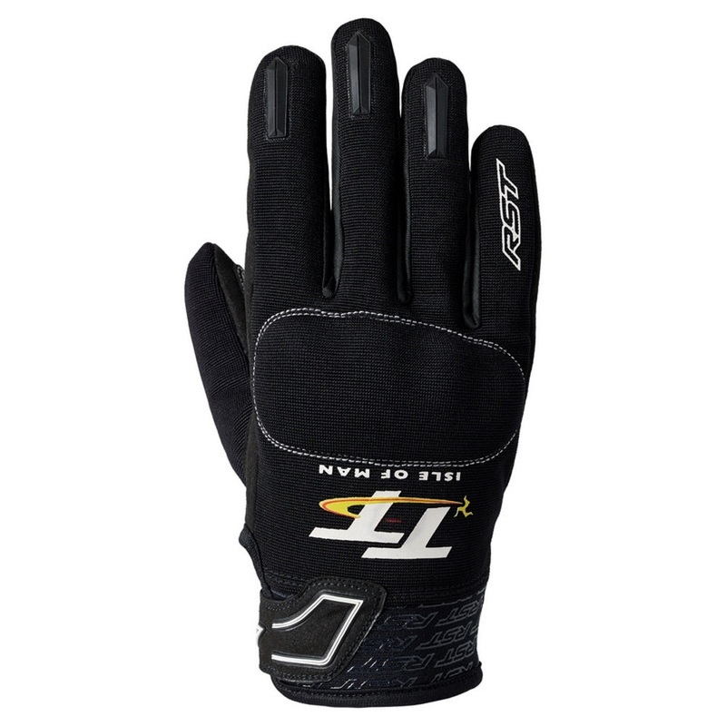 RST IOM Team Evo Mens Glove Black White The IOM TT Team Evo Glove is a homage to RSTs safety partnership with the Isle of Man. Featuring an integrated soft knuckle protector, double layer leather on the palm and perforations for ventilation on the fingers.
