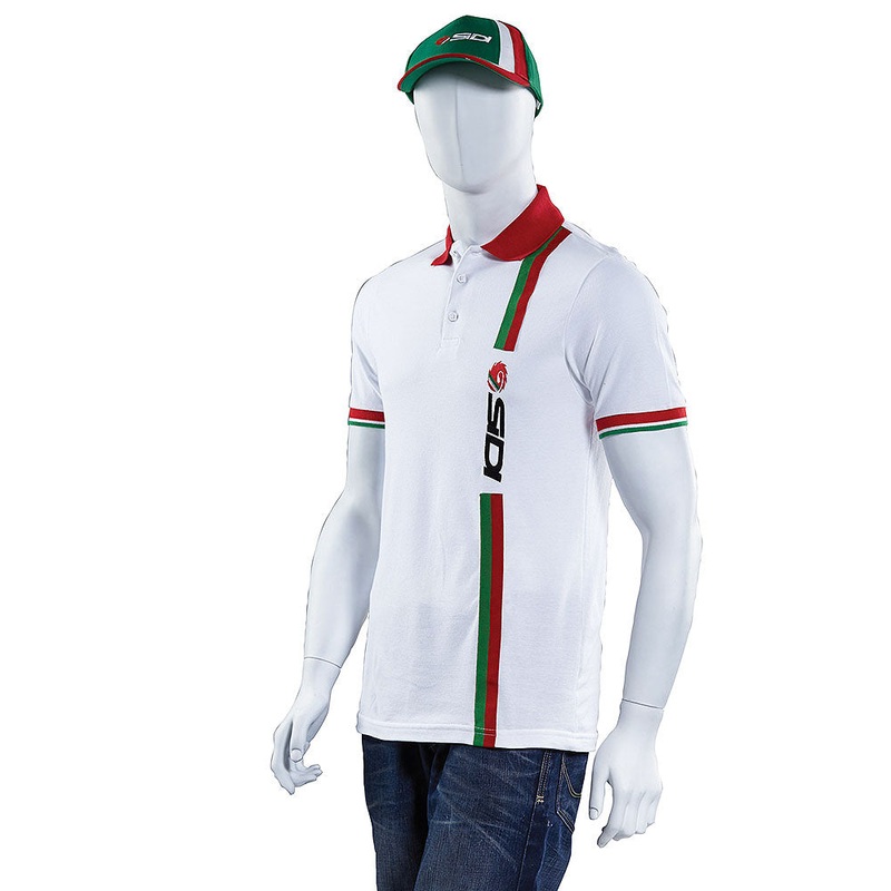 Sidi Polo Shirt Strip White Buttons at collar. Sidi vertical detailing. Sidi Italian stripes on sleeve.