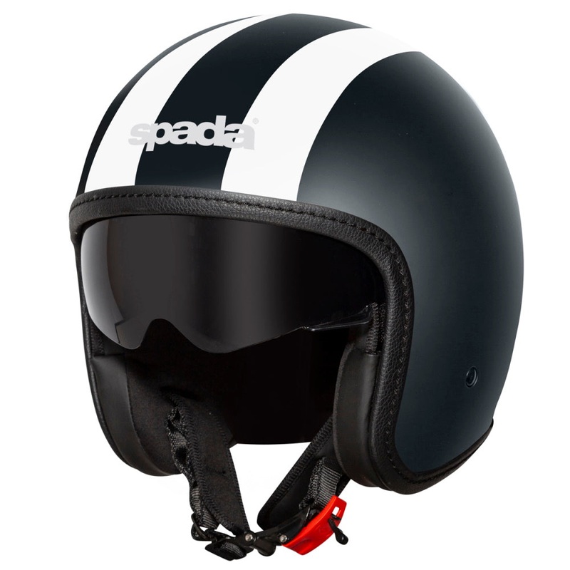 Spada Ace Viper Matt Black White Open Face Helmet ECE 22.05 approved ABS shell Removable lining Quick release buckle Goggle loop at rear Slim profile cheek pads Integral drop-down tinted visor