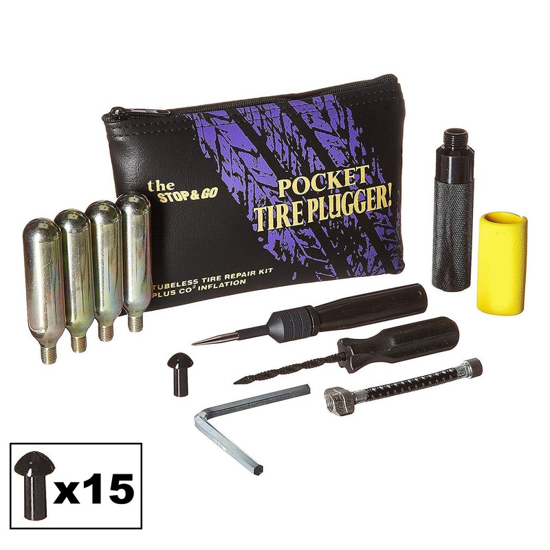 Pocket tyre plugger plus CO2 inflation. Why be stranded? This kit gives you the ability to perform the most effective repair possible without dismounting your tubeless tyre. Kit includes: Nozzle Tire plugging device Steel canisters containing 16 grams each