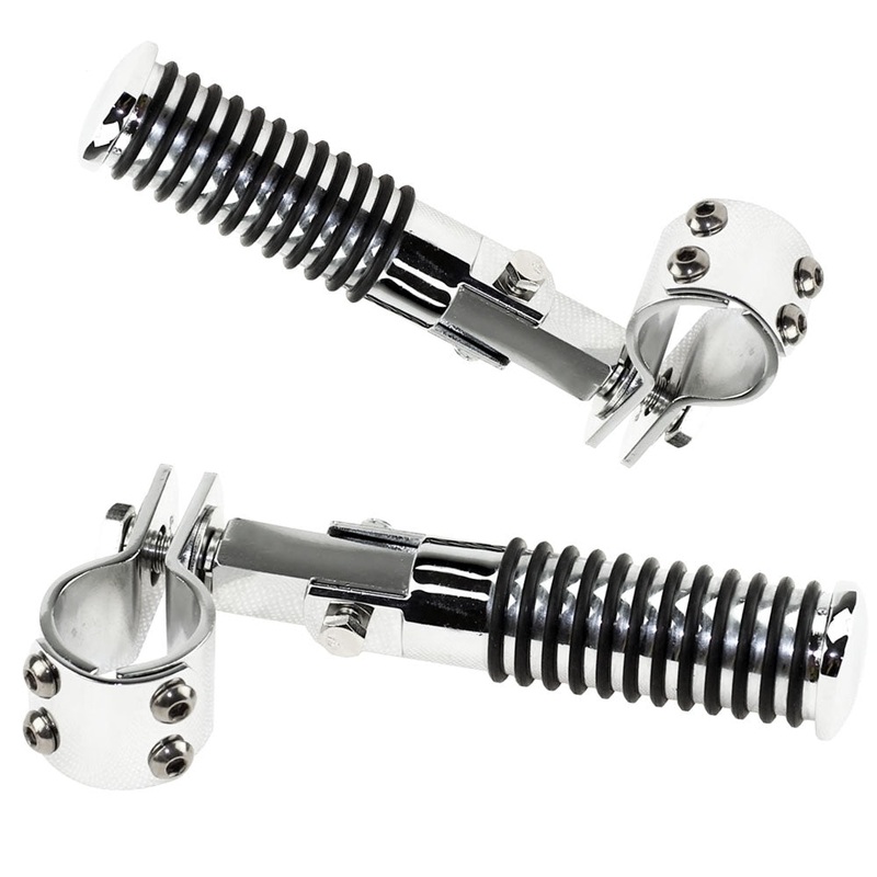 Universal Foot Rests ideal for custom bikes. Length 130mm Internal Width 18mm Total Width 40mm Chrome and black design