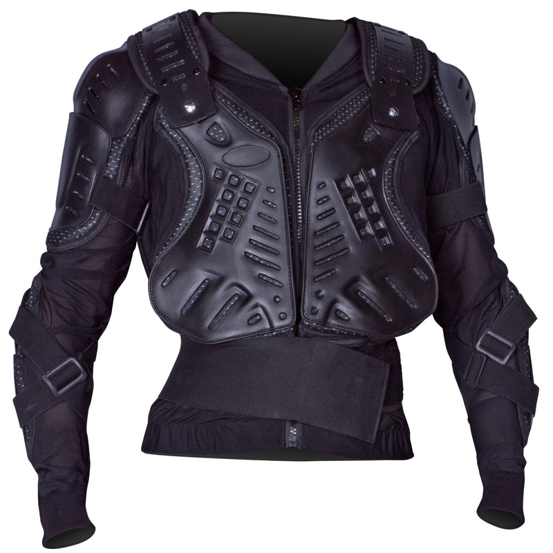 Ergonomic, vented polypropylene panels over a mesh nylon shirt. Chest and rib plates. Overlapping collar bone, shoulder and upper arm plates. Overlapping forearm and elbow plates. Overlapping spinal column plates and vented rib panels. Kidney belt and velcro straps ensure a secure fit.
